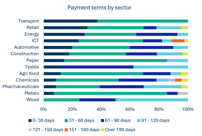 Όσον αφορά τους Τομείς, ξυλεία, υφάσματα και φαρμακευτικές προσφέρουν τους πιο γενναιόδωρους μέσους όρους πληρωμής, ενώ πιο περιοριστικός παραμένει ο τομέας μεταφοράς