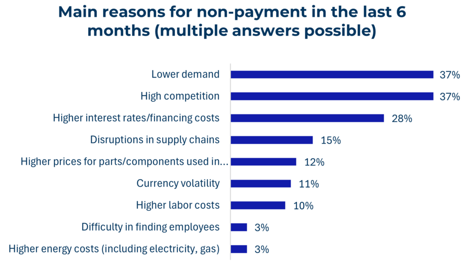 Οι καθυστερήσεις πληρωμών γίνονται ολοένα και πιο διαδεδομένες (το 77% των ερωτηθέντων αναφέρει ότι έχει αντιμετωπίσει καθυστερήσεις πληρωμών), αλλά η μέση διάρκειά τους έχει μειωθεί στις 42 ημέρες, γεγονός που υποδηλώνει ταχύτερη επίλυση σε διάφορους τομείς (ιδίως τα φαρμακευτικά και τα χημικά προϊόντα παρουσίασαν τη μεγαλύτερη πτώση σε σύγκριση με το 2024).