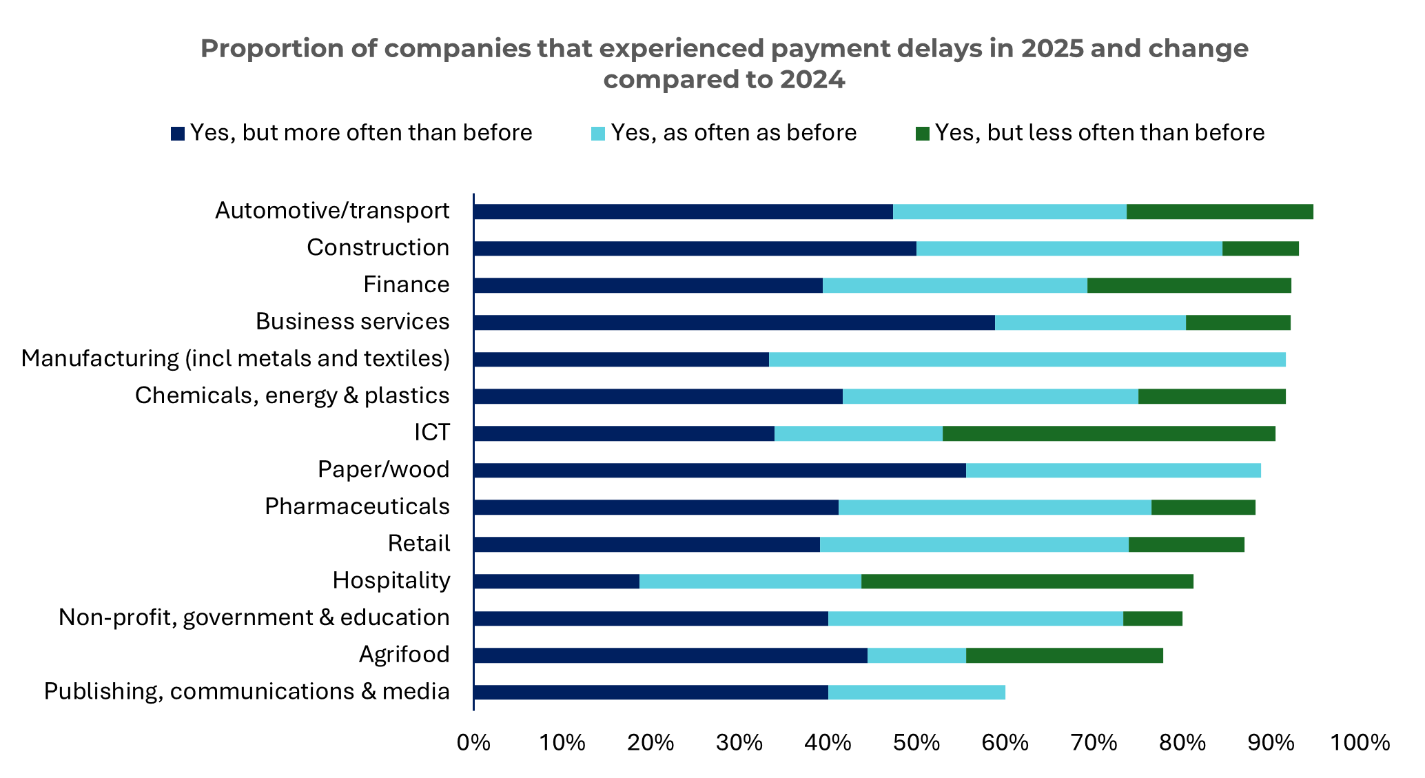 Οι κλάδοι των Κατασκευών και της /Αυτοκινητοβιομηχανίας/Μεταφορώνεπηρεάζονται περισσότερο από τις αυξανόμενες καθυστερήσεις πληρωμών (95% και 93% αντίστοιχα), ενώ οι εκδόσεις, communications & media (60%), αγροδιατροφή (78%), και οι μη κερδοσκοπικοί, κυβερνητικοί και εκπαιδευτικοί οργανισμοί (78%) αναφέρουν λιγότερα προβλήματα. Αυτό οφείλεται συχνά σε μεγαλύτερες προθεσμίες πληρωμής ή σε ισχυρότερη πειθαρχία έναντι των αγοραστών.